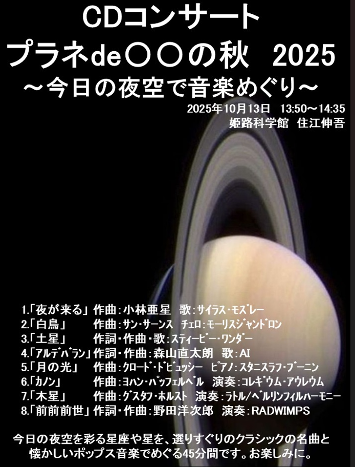 姫路科学館のプラネタリウムでの CDコンサート開催に協力(当研究会会員) 来る10月13日(祝日)開催のCDコンサート「プラネde○○の秋」を担当することとなり、 目下必死で準備を進めています。プラネタリウム・ドームに星や星座を投影しながら、音楽を聴くというイベントで、30年以上続くご長寿企画です。今回はクラシック音楽を強めに打ち出した構成になっています。プラネタリウムの解説を初めて1年半になりますが、若い人たちに混じって楽しくやってます。 音楽と天文にご関心のある方は、ぜひお立ち寄り下さい。 姫路科学館・科学の展示とプラネタリウム | |